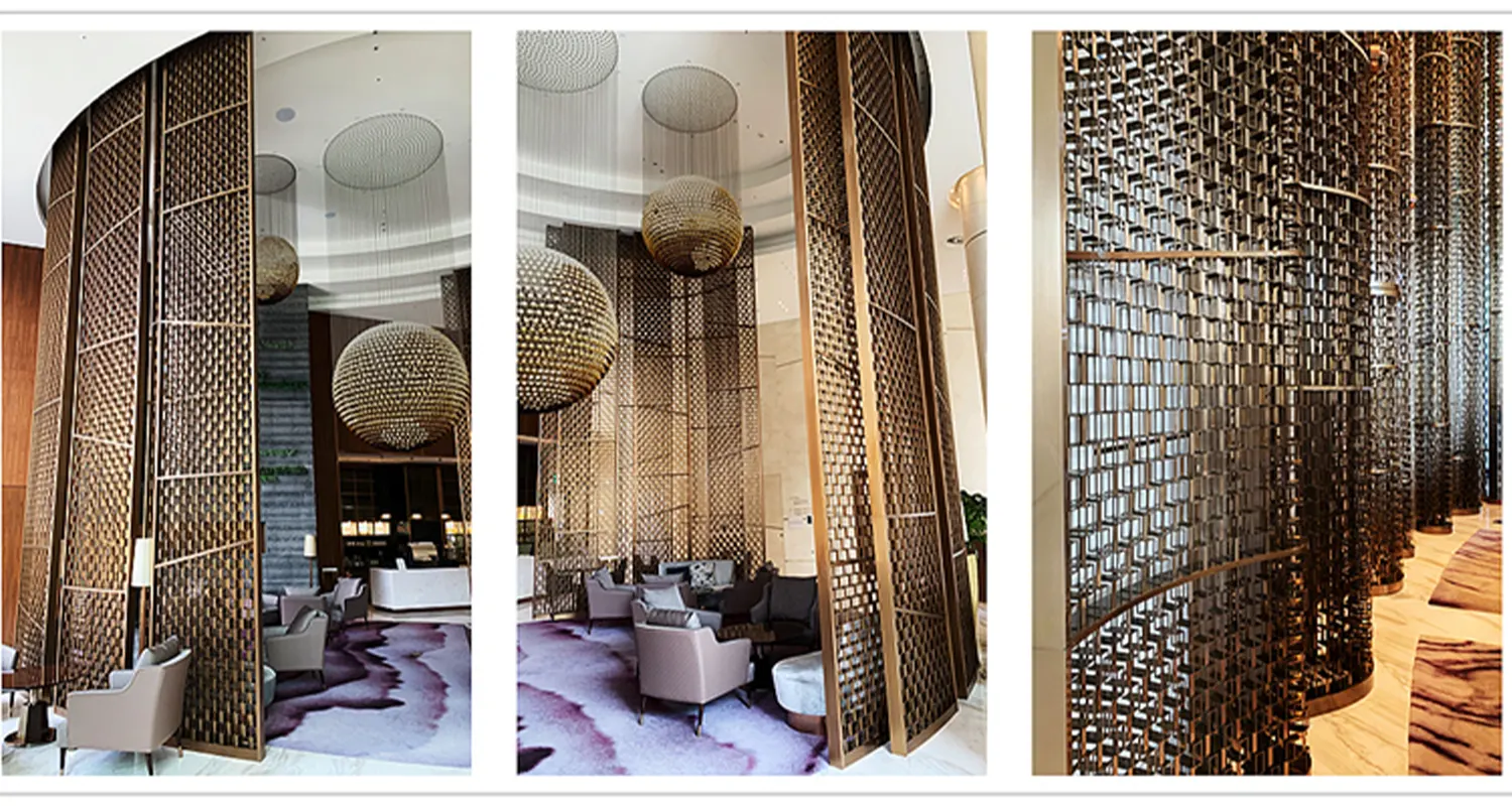 304# stainless steel hollow screen has many advantages over the other two materials. Because the pattern on the surface of the stainless steel hollow screen can change with the decoration environment, it can be used in various high-end places, such as hotels, villas, clubs, restaurants, furniture and other places.
