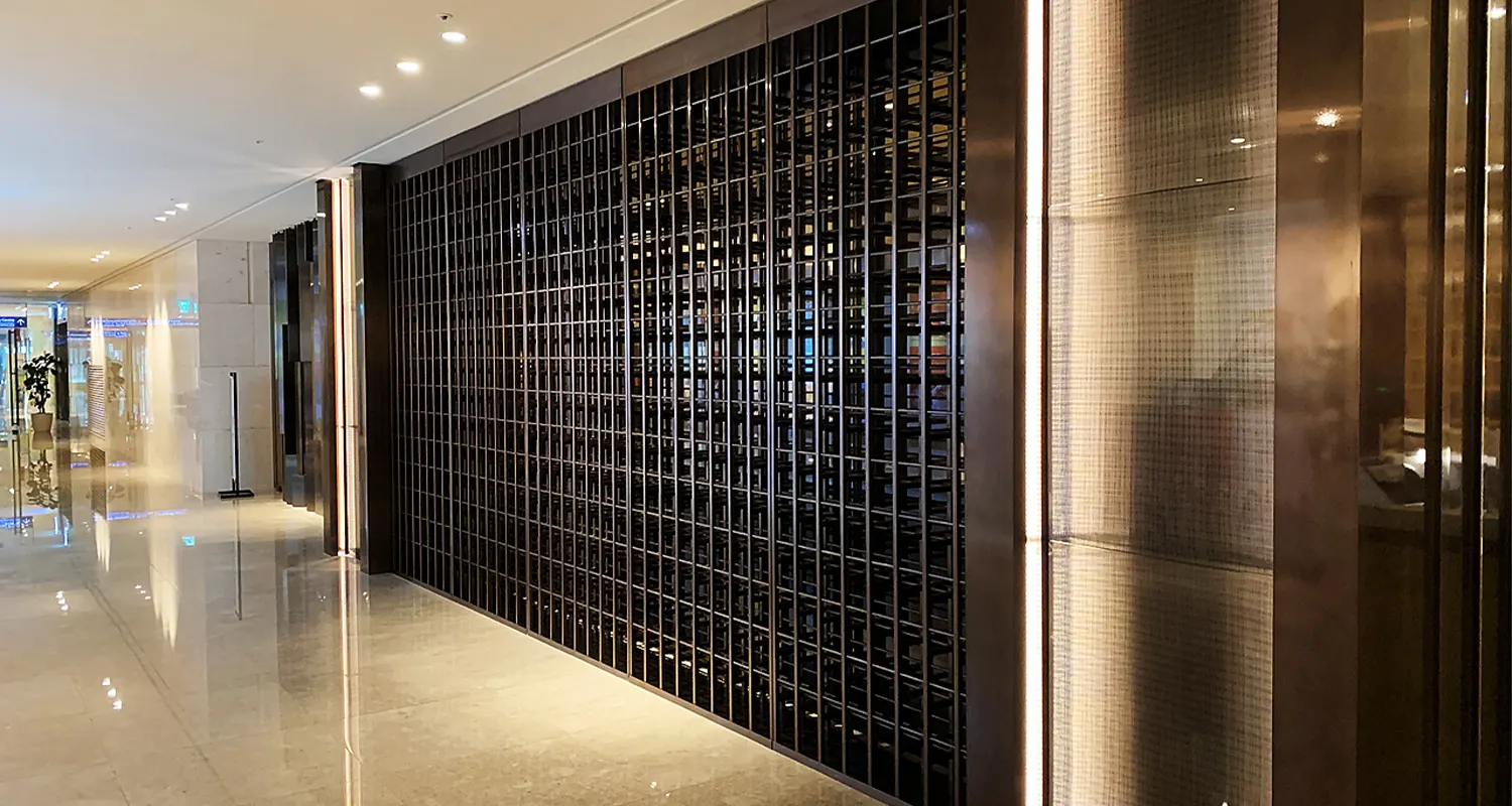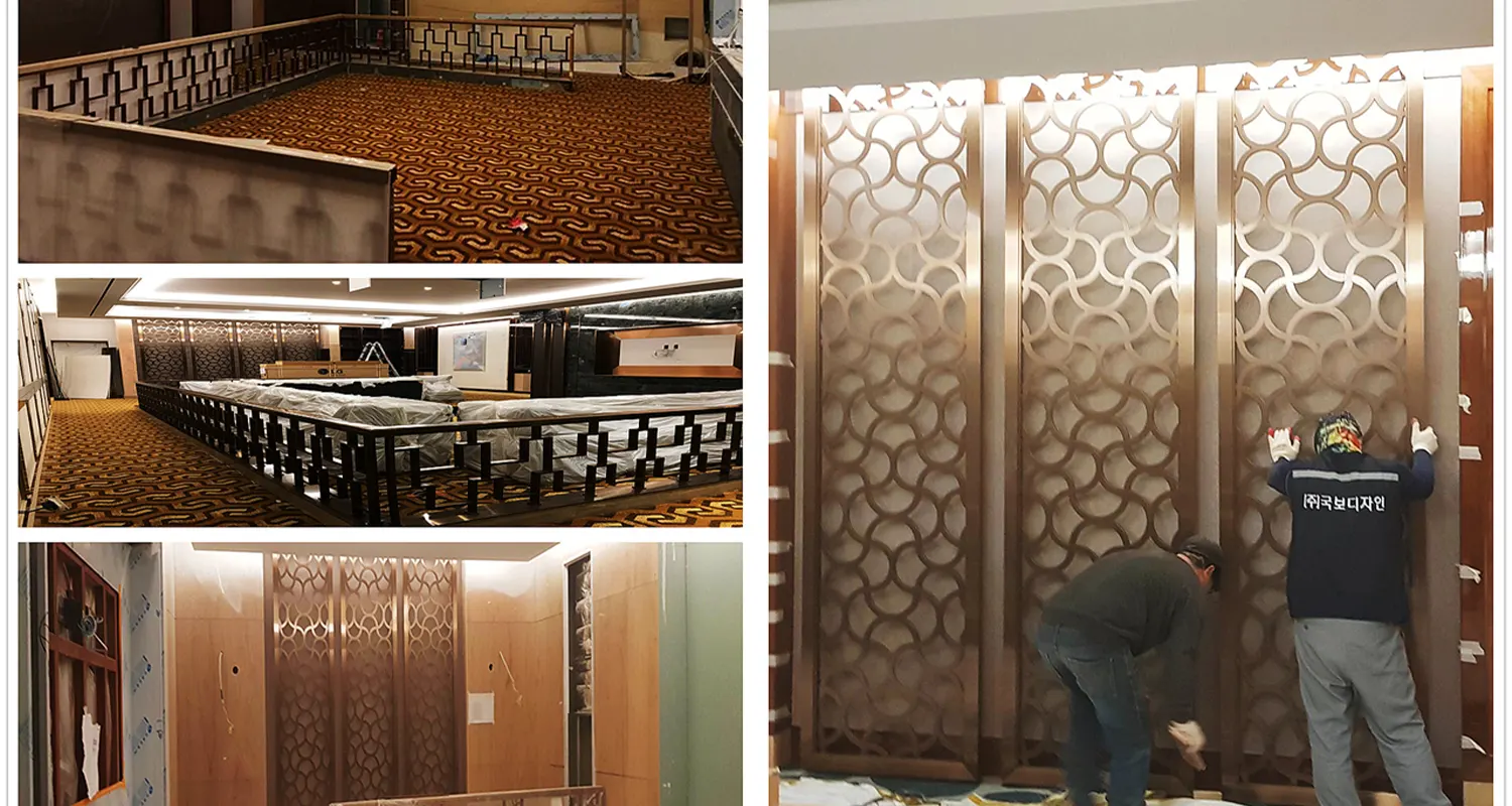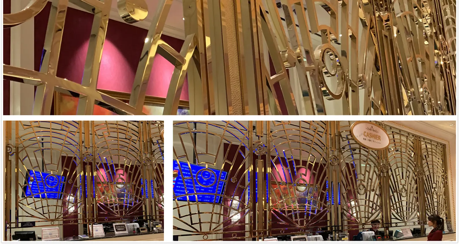In this case, our stainless steel screen decoration scenes can be seen everywhere. The reception center in the lobby adopts a large screen with a thickness of 5mm welded with a height of over 10M. The surface is brushed champagne gold + anti-fingerprint. The screens decorated in KTV rooms, restaurants and corridors are all in the form of stainless steel decorative walls; while the decorative screens in the gaming center are mainly in the form of functional areas and partitions.
